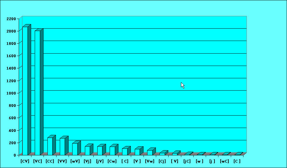Ensuite, on a entrepris de remplacer chaque voyelle par [V], chaque consonne par [C], et on a conservé [j] et [w], puis on a calculé les occurrences des phonatomes correspondants.