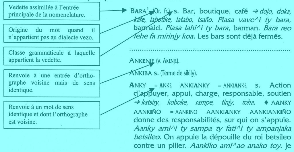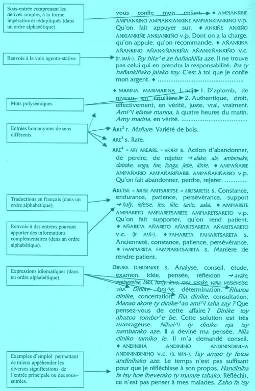 Les termes homonymiques (prononciation identique, orthographe identique mais de sens différents) ont fait chacun l'objet d'une entrée différente marquée par un numéro mis en exposant. Quant aux mots polysémiques, numérotés eux aussi, ils font partie de la même entrée. Ainsi, le mot « anjo » a deux entrées différentes et des polysèmes dans une des entrées: Anjo 1 r. Notion de se baigner --> evoke, laño, lio, lo. A njo 2 s. 1. Date, destin, époque, jour, vie --> ae, date, vinta. 2. Soleil, temps climatique --> masoanjo, taniñ’anjo = taniñ’anjoke. Le signe "=" renvoie à des termes sémantiquement identiques mais morphologiquement ou phonologiquement différents : « aboabo = aboñabo. Ae = ay. Sarotse ty fiaiña = sarotse ty fiay. Afak’amaray = fakamarae ».
