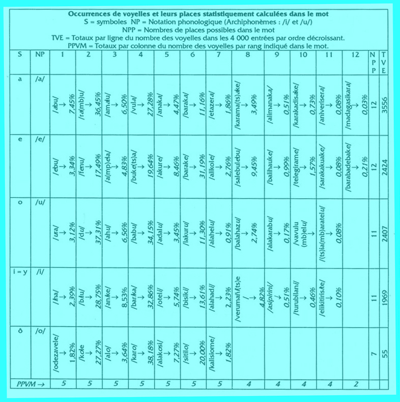 En outre, on a pu calculer avec une faible marge d'erreurs, les occurrences de consonnes, de voyelles, de diphtongues et de triphtongues, leurs places possibles dans le mot et d'autres statistiques qu'on retrouve dans les tableaux suivants.
