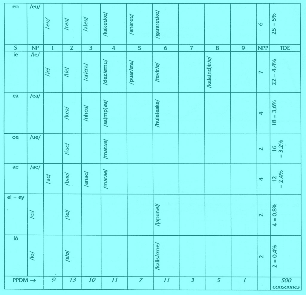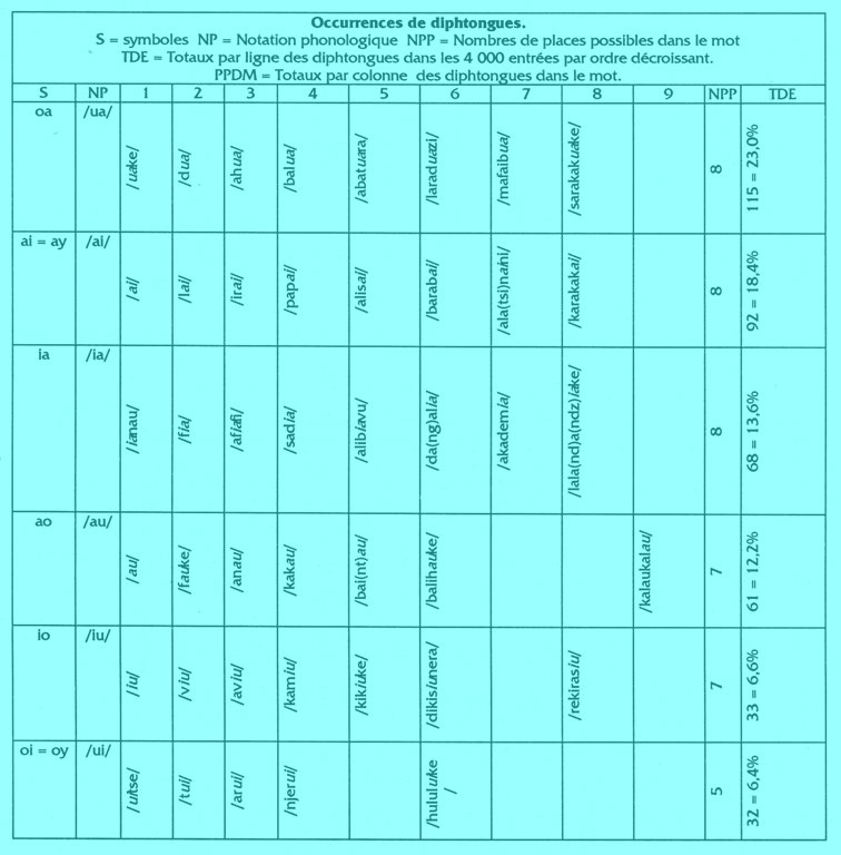 Phonétiquement, une diphtongue est une voyelle dont le timbre se modifie en cours d'émission, mais phonologiquement le problème est plus complexe car nous avons relevé des paires minimales qui opposent non seulement des diphtongues entre elles mais aussi des constituants de diphtongues entre eux. On peut avoir les oppositions /lia/ ~/leu/ (diphtongues différentes) et /lia/ ~/liu/ (constituants de diphtongues différents). Un phonème ou deux phonèmes ? Nous n'avons pu résoudre ce problème. Pour la suite, afin de simplifier le traitement informatique des statistiques, nous avons, sauf indication contraire, considéré qu’une diphtongue ou une triphtongue était constituées de deux ou trois phonèmes. La différence dans les résultats est très faible si on considère l’un ou l’autre cas.