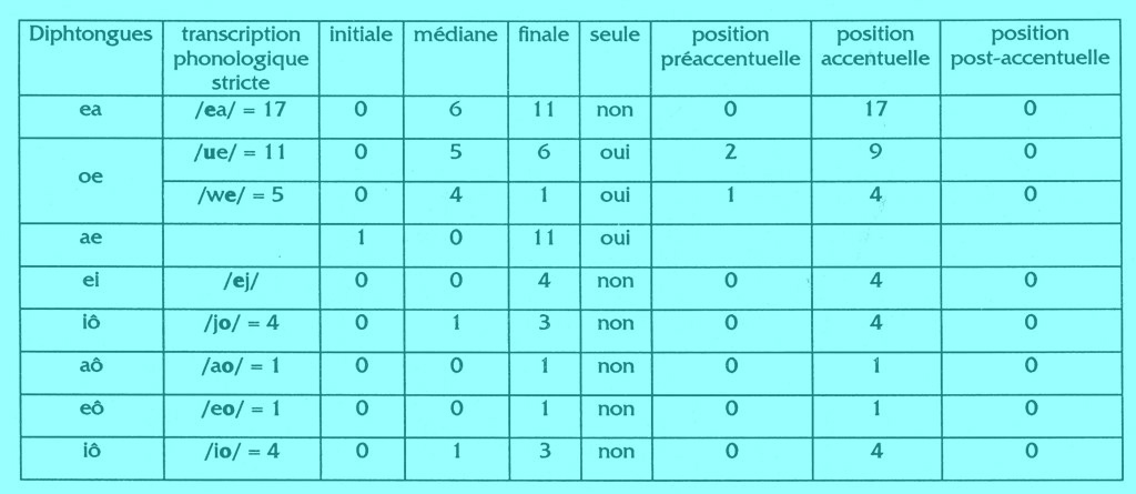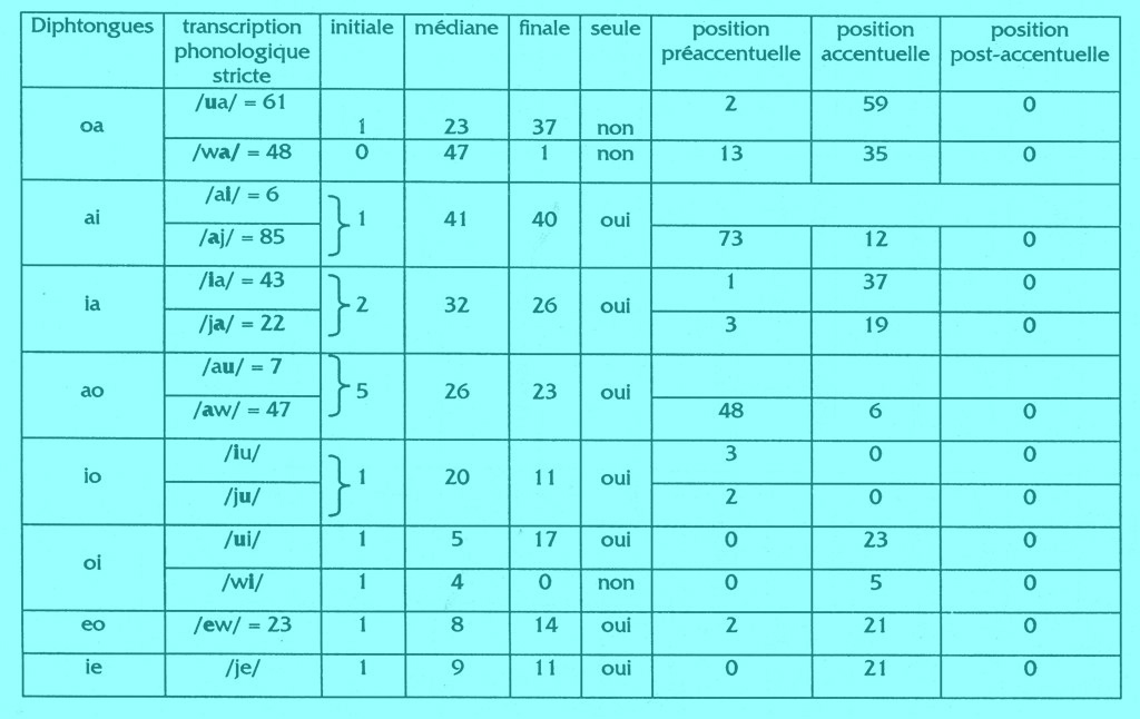 Le tableau suivant montre les possibilités d'apparition des diphtongues seules ou dans le mot.
