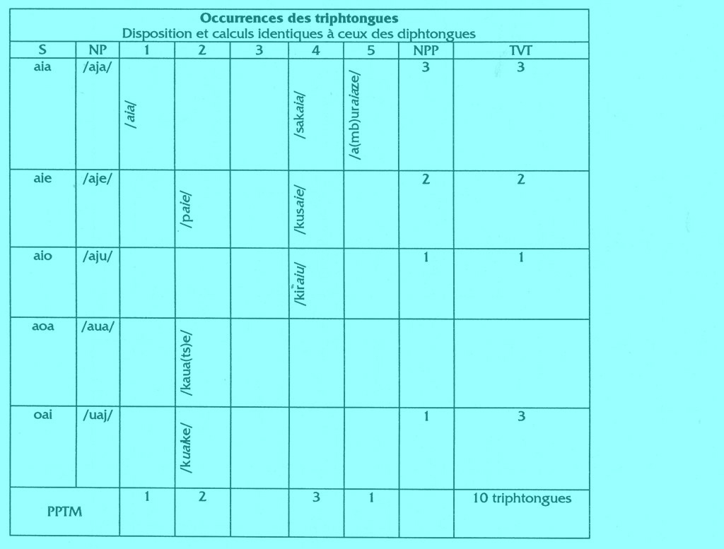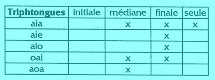 Le tableau suivant montre les possibilités d'apparition des triphtongues dans le mot ou seules.
