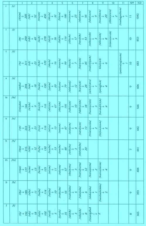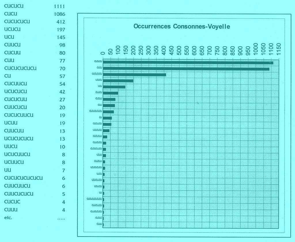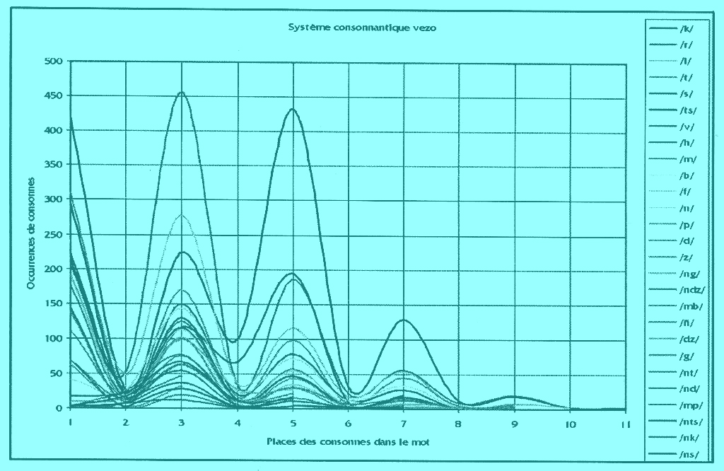 Enfin, si l’on remplace les consonnes par « C » et les voyelles par « U », on va pouvoir analyser en détail, dans le graphe qui suit, le système vocalique vezo. Les mots sont surtout formés de deux ou trois syllabes ouvertes.