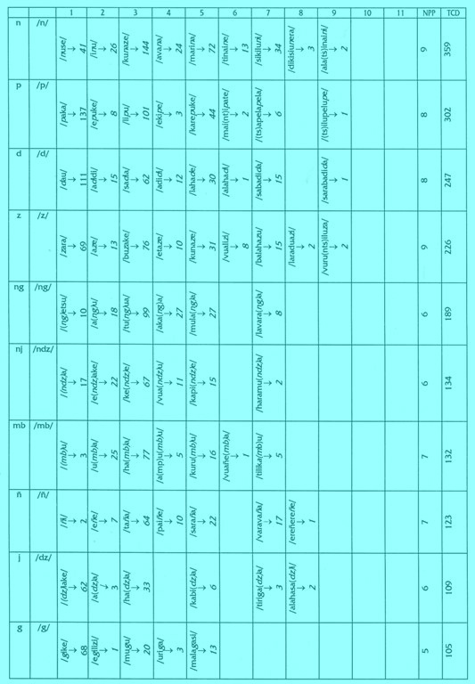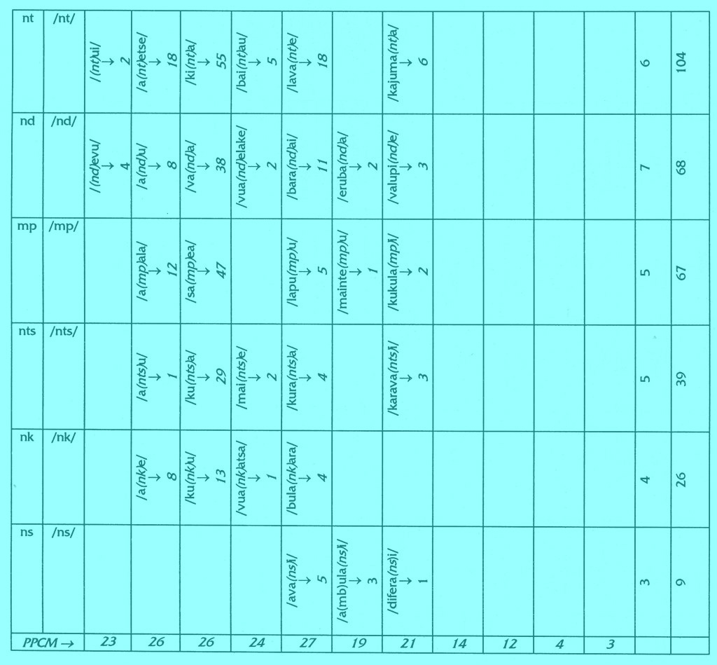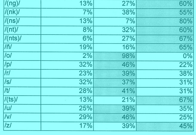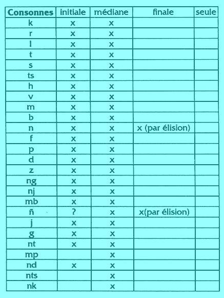 Les consonnes n'apparaissent pas seules ou en fin de mot (sauf suite à une élision). Toutes apparaissent en initiale ou en médiane sauf "mp, nts, nk" qui n'apparaissent pas en initiale. "ñ" apparaît toujours en médiane. En initiale, le cas est très rare.