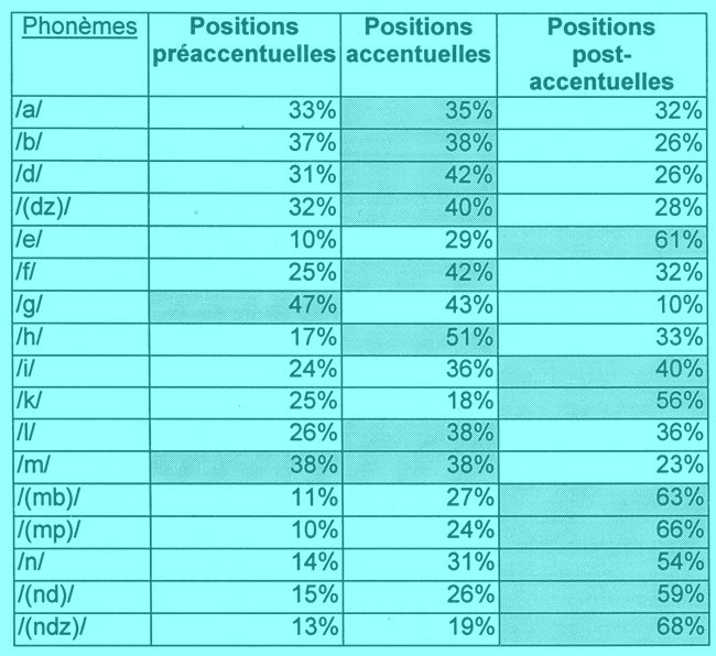 La position accentuelle ou non englobe la syllabe entière ce qui explique dans le tableau précédent qu’une consonne ou une voyelle peuvent se trouver en position accentuelle ou non. Les parties grisées montrent la préférence globale pour la lettre dans le mot par rapport à l’accent.