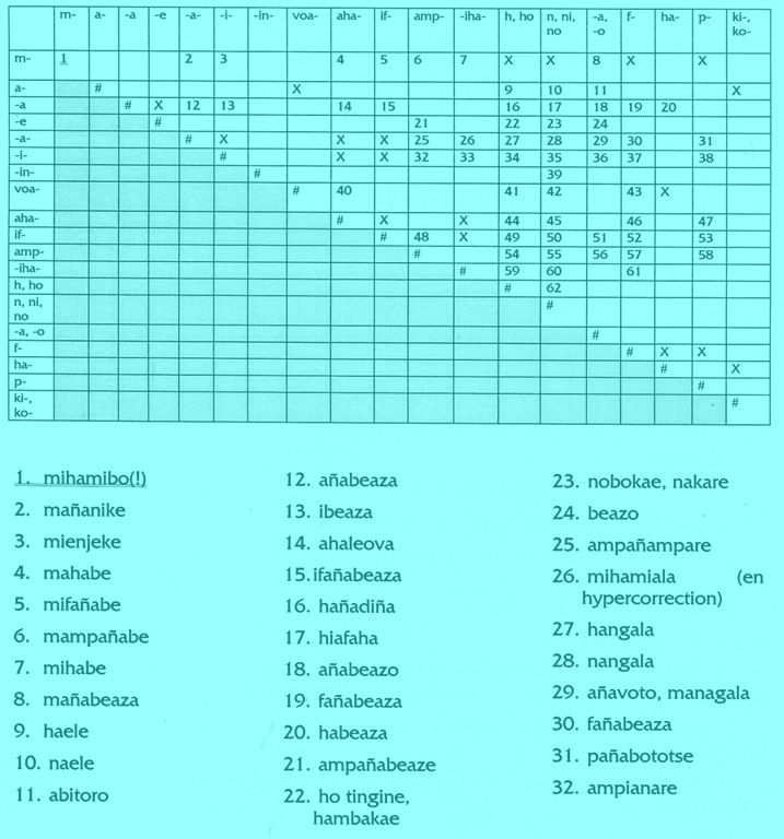 Nombre de ces affixes sont compatibles entre eux et d'autres s'excluent mutuellement. Notons le cas un peu étonnant de la voix agento-stative où, dans une conversation, on entend souvent par exemple "mihamiakatse, mihamiala, etc. Avons-nous là un cas d'hypercorrection ?