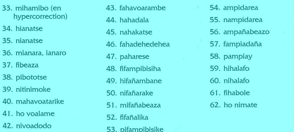 Monèmes : "Avy, abo, azo, fote, meloke, rava, garay, maro, kele, soa, tampake, ela, faly, tsatse, tsereke…". Synthèmes : "Fahefatse, sere…".
