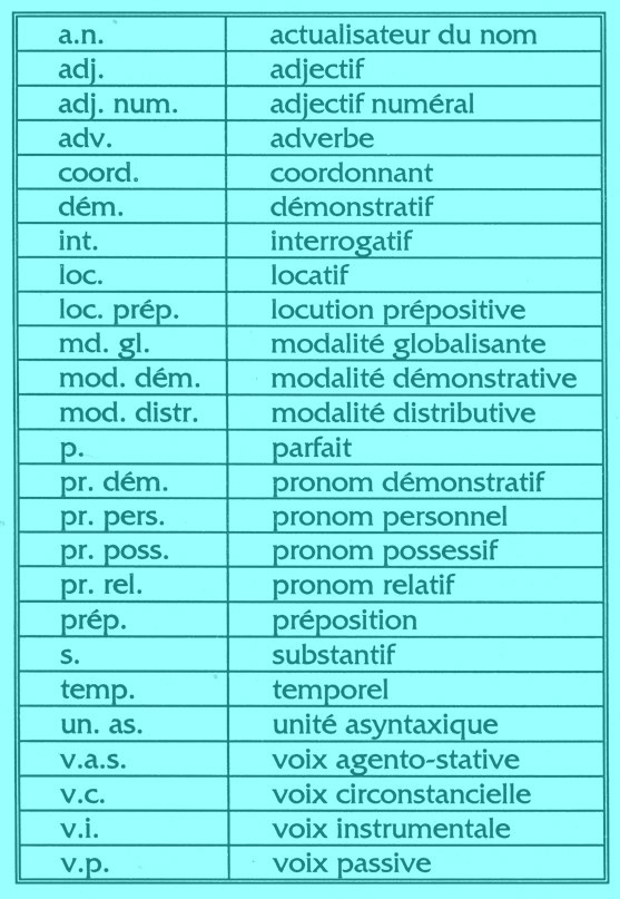 Dans le dictionnaire, les classes de mots ont été notées en abrégé. Le tableau suivant permet de voir à quoi correspond ces abréviations.