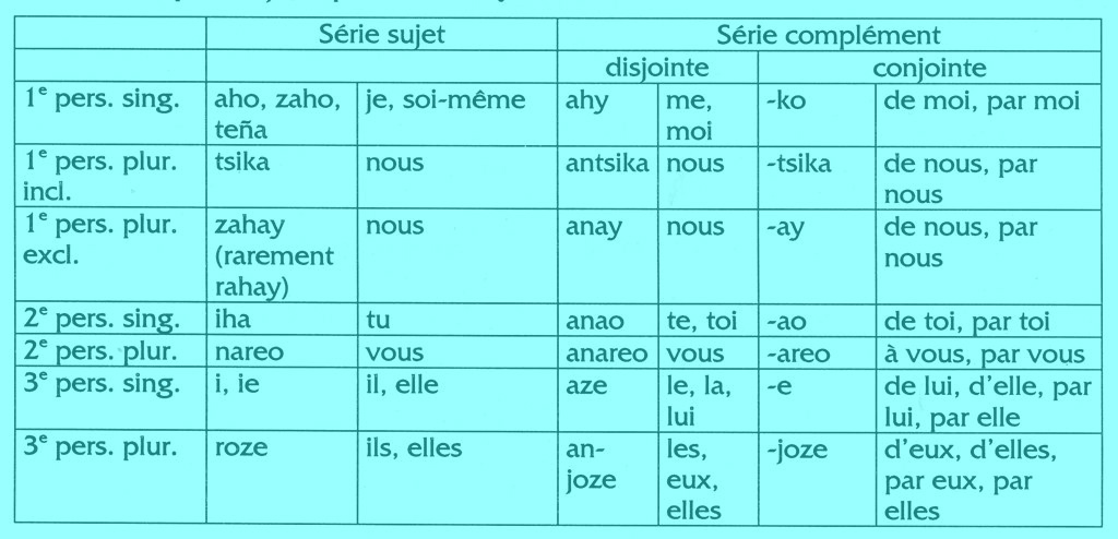 La classe des pronoms personnels comprend des unités disjointes en fonction sujet pouvant se placer après le prédicat ou avant si on désire une mise en valeur. Une autre série comprend des unités disjointes en fonction complément objet et une série conjointe en fonction complément d'agent. Lorsqu'une unité est liée à un nom, elle se traduit alors par l'adjectif possessif français.