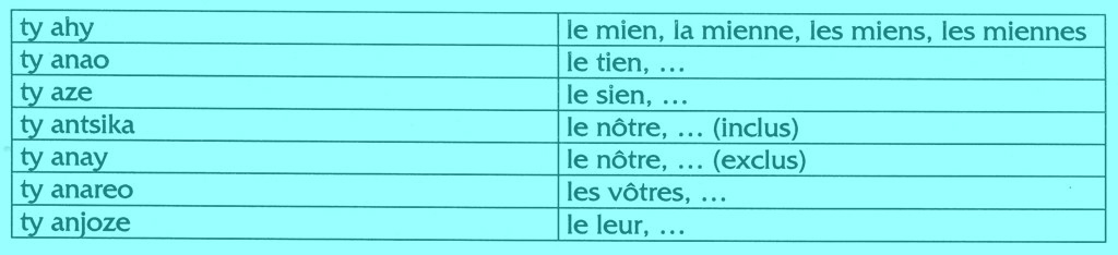 Les pronoms possessifs sont des pronoms personnels disjoints compléments d'objets auxquels est antéposé l'actualisateur "ty" :