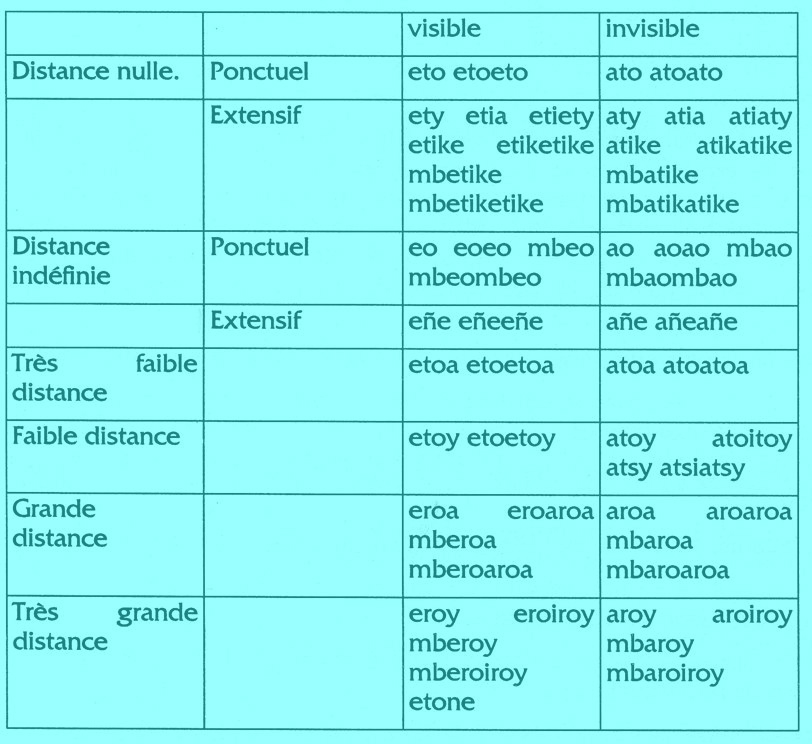 Les unités dont le signifiant commence par "e" désignent des lieux visibles et celles dont le signifiant commence par "a" désignent des lieux invisibles souvent délimités de façon vague. Certaines unités incluent ou non le locuteur, le lieu étant étendu (extensif) ou circonscrit (ponctuel). Elles précisent aussi les distances par rapport au locuteur (distance minimale, moyenne ou maximale). L'espace considéré est toujours relatif. Il peut être la terre entière ou un endroit restreint comme dans la maison. On peut dire : An-dafe añe, à l'extérieur du pays ou dire "añ'efitsaño añe", dans la pièce la plus éloignée de la maison. La langue vezo utilise beaucoup les locatifs. C'est normal, car le pays et la mer sont des étendues le plus souvent sans point de repère concret. L'utilisation fréquente de locatifs variés permet une appréciation assez correcte des distances visibles ou invisibles. Le tableau ci-dessous donne une idée du nombre possible de locatifs employés.